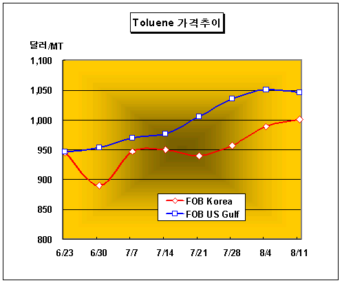 FOB Korea 1001달러로 12달러 상승 … 바이오에탄올의 보조제 역할 톨루엔(Toluene) 가격은 8월11일 FOB Korea 톤당 1000-1002달러로 12달러 상승했다.아시아 톨루엔 시장은 국제유가 강세와 미국의 휘발유 첨가제용 수요 호조에 힘입어 1000달러대 고지에 올랐다. 국제유가는 8월11일 WTI(서부텍사스중질유) 선물가격이 배럴당 74.35달러로 전일대비 0.35달러 상승했고 두바이유 현물가격은 배럴당 70.49달러로 0.38달러 하락했다. 미국의 휘발유 첨가제 수요는 63억-66억갤런 수준으로 휘발유의 옥탄가를 높여주는 역할을 하며 휘발유 가격에 따라 시세가 결정되고 있다. 최근에는 MTBE(Methyl Tert-Butyl Ether) 대신 바이오에탄올 첨가 수요가 늘고 있는데 바이오에탄올 첨가 시 휘발유 내의 증기압이 높아지는 단점을 톨루엔 첨가로 해결하고 있어 수요가 꾸준할 것으로 판단된다. CFR China 가격은 톤당 1015-1020달러, CFR SE Asia는 톤당 1005-1010달러를 형성했으며 중국 내수가격은 ex-Tank 톤당 9375-9425위안에 마감됐다.
