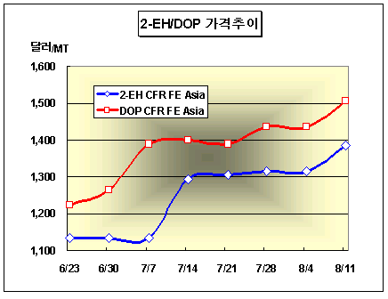 표, 그래프: | 2-EH/DOP 가격추이 | <화학저널 2006/08/18> | ||||||||||||||||