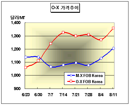 중국수요 호조에 상종가 지속 … M-X와의 스프레드 153달러 O-X(Ortho-Xylene) 가격은 8월11일 FOB Korea 톤당 1355-1360달러로 88달러 급등했다.아시아 O-X 시장은 업스트림인 M-X(Mixed-Xylene) 가격강세와 중국 수요기업들의 매수세 및 수급타이트에 힘입어 1300달러대 재진입에 성공했다. M-X는 FOB Korea 톤당 1205달러로 75달러 급등했으며 KP케미칼의 울산 소재 No.1 P-X(Para-Xylene) 20만톤/O-X 4만톤 플랜트가 8월말까지 정기보수를 진행할 계획이다. 중국 Zhenhai Refining & Chemical, Sinopec Yangzi Petrochemical, CNPC Jilin Petrochemical 등 주요 공급기업들의 가동률은 8월 이후에나 상승할 것으로 파악되고 있다. CFR China/SE Asia 가격은 톤당 1385-1395달러에 마감됐다.