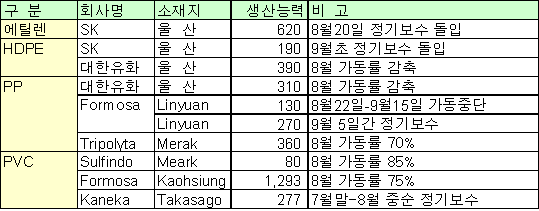 | 원료코스트 강세 따라 감축운영 … SK는 9월 정기보수 계획대한유화가 PE(Polyethylene) 및 PP(Polypropylene) 설비의 가동률을 다소 감축한 것으로 나타났다. 대한유화는 원료코스트 강세에 따라 울산 소재 HDPE(High-Density PE) 총 39만톤 및 PP 총 31만톤 플랜트의 감축운영을 실시하고 있다. 8월12일 가동중단됐던 폴리미래의 No.1 설비는 8월21일, 8월8일 중단됐던 No.3 설비는 8월26일 재가동에 들어갈 예정이다.