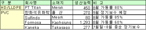 | Sinopec Qilu는 8월18일 가동재개 … PVC 가동률 낮아 초비상한화석유화학의 울산 소재 PVC 27만톤 설비가 9월 정기보수를 계획하고 있다. 울산 플랜트는 9월 2주간의 정기보수를 예정하고 있으며 한화의 PVC(Polyvinyl Chloride) 생산능력은 울산 및 여수 총 50만톤에 이르는 것으로 파악되고 있다. 중국 Sinopec Qilu Petrochemical은 8월14일 낙뢰에 인한 정전으로 컴플렉스가 전면 가동중단된 이후 8월18일 재개됐는데 합성수지 생산능력은 PVC 60만톤, HDPE(High-Density PE) 14만톤, LDPE(Low-Density PE) 14만톤, LLDPE(Linear LDPE) 13만톤에 이르는 것으로 나타났다.