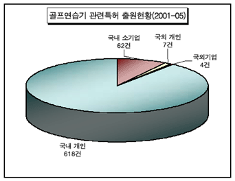 특허청에 따르면, 골프연습기 관련 특허ㆍ실용신안 출원은 2001년 이전에는 1년 평균 24건이 출원됐으나 2001년 이후에는 1년 평균 138건이 출원돼 5.6배 이상 급격히 증가했고, 특히 국내 개인 출원이 제일 큰 비중을 차지하는 것으로 나타났다. 골프연습기 관련 세부 분야 가운데 퍼팅 연습기에 관련된 출원건수가 2001-05년 총 328건으로 전체 출원건수 691건 가운데 약 47%를 차지하고 있으며, 골프공 비거리ㆍ방향 측정 장치, 경사면 조절 장치, 스윙자세 분석ㆍ교정 장치 순으로 출원 건수가 많았다. 특히, 골프공 비거리ㆍ방향 측정, 경사면 조절, 골프채 헤드 속도 측정 장치 등이 복합적으로 구성되는 골프 시뮬레이션 장치는 2001년 이후 매년 5건 이상 꾸준하게 출원되고 있다. 표, 그래프: | 골프연습기 관련특허 출원현황(2001-05) | <화학저널 2006/08/25> |