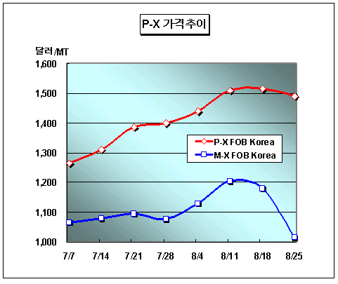 M-X가격은 FOB Korea 톤당 1015달러로 165달러 폭락했으며 KP케미칼의 울산 No.1 O-X(Ortho-Xylene) 4만톤/P-X 20만톤 플랜트는 6월초 시작된 정기보수를 마무리하고 8월24일 재가동에 돌입했다.