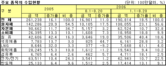 산업자원부가 발표한 <2006년 8월 수출입 실적 및 전망>에 따르면 8월 수입은 전년동월대비 23.1% 증가한 270억9000만달러를 기록한 것으로 추정됐다.