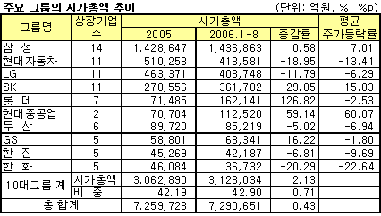 SK 15.03% 상승에 한화 22.64% 하락 … LG는 6.29% 떨어져 SK그룹의 주가가 크게 상승한 반면 한화그룹의 주가가 크게 하락해 희비가 엇갈리고 있다.증권선물거래소가 발표한 <주요 그룹 시가총액 및 주가등락 현황>에 따르면, 2006년 10대그룹의 시가총액은 2005년말 306조2000억원에서 2006년 8월말 현재 312조8000억원으로 2.13% 증가했다.
