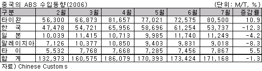 표, 그래프: | 중국의 ABS 수입동향(2006) | <화학저널 2006/09/08> |