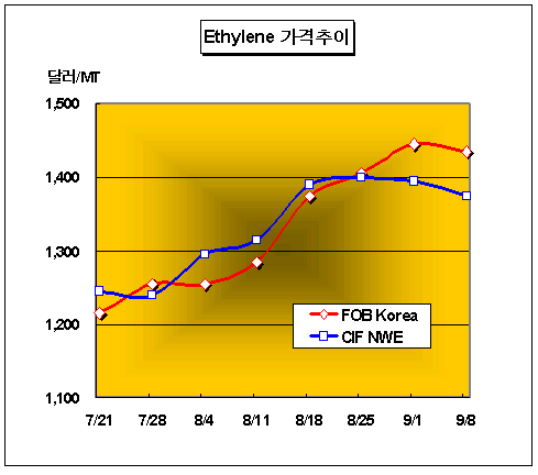 FOB Korea 1435달러로 하락 기미 … 다운스트림 가동률 저하 에틸렌(Ethylene) 가격은 9월8일 FOB Korea 톤당 1430-1440달러로 10달러 하락했다.아시아 에틸렌 시장은 국제유가 및 나프타(Naphtha) 약세와 다운스트림 부문의 가동률 저하에 따라 하락세 전환의 기미를 나타냈다. 국제유가는 9월8일 WTI(서부텍사스중질유) 선물가격이 배럴당 66.25달러로 전일대비 1.07달러, 두바이유 현물가격은 배럴당 63.07달러로 0.54달러 하락했다. 나프타 가격은 9월8일 C&F Japan이 톤당 567.25-573.25달러로 39달러, FOB Singapore가 톤당 534달러로 35달러 급락했다. 다운스트림인 PE(Polyethylene) 부문에서는 에틸렌 강세에 따라 감산이 지속되고 있으며 Mitsui Chemical과 Idemitsu Kosan의 합작기업인 Prime Polymer는 Ichihara 소재 LLDPE(Linear Low-Density PE) 20만톤 플랜트의 10월 정기보수를 앞두고 있어 시장참여를 자제하고 있다. 게다가 8월19일 가동이 중단돼 8월24일 유지보수에 돌입한 Mitsubishi Chemical의 Kashima 소재 No.1 에틸렌 34만톤 크래커가 9월10일 재가동에 들어가 수급안정이 기대되고 있는 상황이다. CFR FE Asia 가격은 톤당 1465-1475달러, CFR SE Asia 가격은 톤당 1490-1500달러를 형성했다.