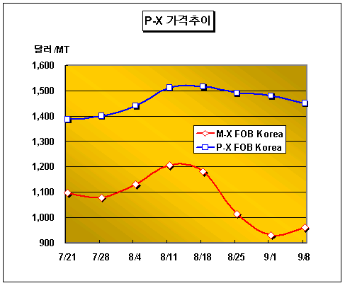 FOB Korea 톤당 1450달러 형성 … M-X는 960달러로 30달러 상승 P-X(Para-Xylene) 가격은 9월8일 FOB Korea 톤당 1449-1451달러로 30달러 하락했다.아시아 P-X 시장은 업스트림인 M-X(Mixed-Xylene) 상승세에도 불구하고 미국산 Cargo의 아시아 대량유입에 따른 공급완화로 하락세를 이어갔다. M-X 가격은 FOB Korea 톤당 960달러로 30달러 상승했으며 P-X와의 스프레드는 전주 톤당 550달러에서 톤당 490달러로 좁혀졌다. 미국산 10월 인도분 5000톤 Cargo는 FOB US Gulf 톤당 1370달러, 11월 인도분 5000톤 Cargo는 FOB US Gulf 톤당 1340달러에 낙찰됐으며 톤당 60달러의 운송코스트가 더해져 CFR Taiwan 톤당 1430달러, 1400달러에 거래됐다. 다만, 타이완 CPC의 Lin Yuan 소재 No.3 P-X 26만톤 플랜트가 10월초까지 유지보수를 진행하고 Japan Energy, Nippon Oil, Idemitsu가 아시아 9월 계약가격(CP)을 전월대비 170달러 인상한 CFR Asia 톤당 1400달러로 고시해 주요 변수가 될 전망이다.