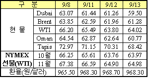9월13일 59.50달러로 1.76달러 급락 … Brent유 하락에 WTI는 상승 두바이(Dubai)유 가격이 급락했다.한국석유공사에 따르면, 9월13일 거래된 중동산 두바이유 현물가격은 배럴당 59.50달러로 전날보다 1.76달러 하락했다. Brent유 현물가격은 배럴당 0.68달러 하락한 61.28달러를 형성했고, WTI(서부텍사스 중질유) 현물가격은 배럴당 0.22달러 상승한 64.02달러에 거래됐다. NYMEX(뉴욕상업거래소) WTI 선물유가는 배럴당 0.21달러 상승한 63.97달러, IPE(영국 국제석유거래소) Brent 선물유가는 배럴당 0.02달러 상승한 63.01달러에 거래가 종료됐다.