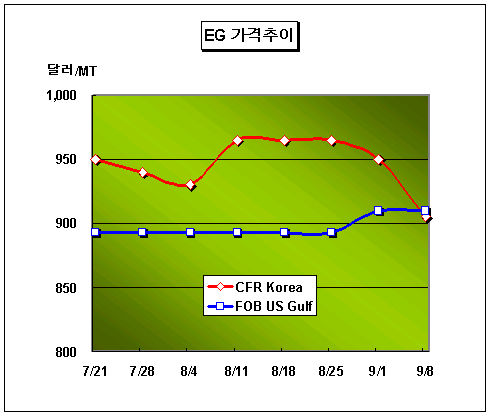 CFR Korea 톤당 900-910달러 형성 … Shell 캐나다 설비 정기보수 MEG(Monoethylene Glycol) 가격은 9월8일 CFR Korea 톤당 900-910달러로 45달러 급락했다.아시아 MEG 시장은 에틸렌(Ethylene) 가격하락과 중국 폴리에스터(Polyester) 부문의 수요 저하로 900달러대 붕괴 위험을 안고 있다. 에틸렌 가격은 9월8일 FOB Korea 톤당 1430-1440달러로 10달러 하락했으며 중국의 일부 폴리에스터 생산기업들은 MEG 가격강세에 감산을 지속하고 있는 것으로 파악되고 있다. 미국시장은 Shell의 정기보수에 수급타이트가 전개되고 있는데 8월22일 시작된 캐나다 Scotford 소재 MEG 45만톤 설비의 정기보수는 9월25일 마무리될 예정이다. Shell은 루이지애나 Geismar 소재 No.1 9만톤 플랜트를 2006년 말 폐쇄하는 등 수익 제고를 위한 구조조정에 박차를 가하고 있다.