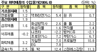 한은, 자일렌 7.0%에 EG는 7.8% 올라 … 나프타ㆍ벙커C유는 내려 주요 화학제품의 수입물가가 크게 오른 것으로 나타났다.한국은행이 발표한 <2006년 8월 수출입물가 동향>에 따르면, 2006년 8월 수입은 7월에 비해 1.6% 상승했다. 원자재 수입물가는 전월대비 1.6%, 전년동월대비 9.8% 상승했다.