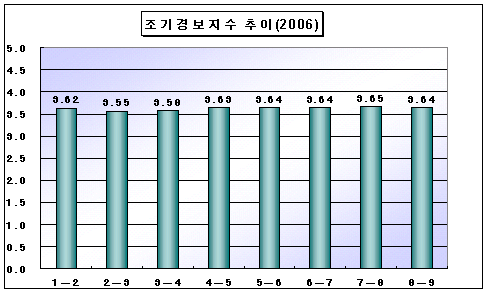 조기경보지수는 미국 원유재고 감소, 미국 산업생산지수 상승, 미국 실질실효환율 하락 등 조기경보지수 상승요인에도 불구하고 두바이유 가격 하락, OPEC 생산 증가 등 하락요인의 영향으로 전월대비 0.01p 하락했다. 표, 그래프: | 조기경보지수 추이(2006) | <화학저널 2006/09/15> |