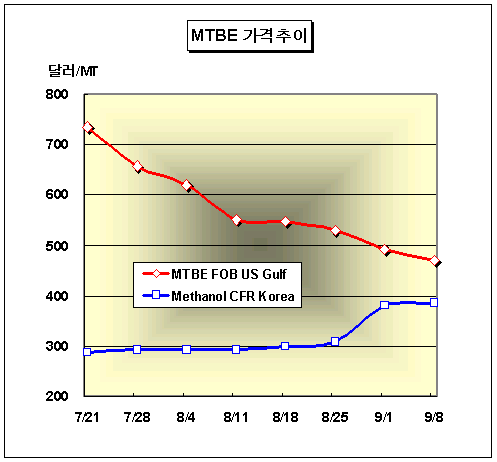 FOB Singapore 톤당 585달러 형성 … 메탄올 가격은 385달러 강세 MTBE 가격은 9월8일 FOB Singapore 톤당 580-590달러로 60달러 급락했다.아시아 MTBE(Methyl Tertiary Butyl Ether) 시장은 국제유가 약세와 휘발유 Blending 부문의 수요 감소로 600달러대 붕괴를 맞이했다. 국제유가는 9월8일 WTI(서부텍사스중질유) 선물가격이 배럴당 66.25달러로 전일대비 1.07달러, 두바이유 현물가격은 배럴당 63.07달러로 0.54달러 하락했다. 특히, 미국시장을 중심으로 바이오에탄올의 MTBE 대체가 가속화되고 있는 상황에서 휘발유 성수기도 마감돼 가격약세를 견인하고 있는 것으로 파악되고 있다. 업스트림인 메탄올(Methanol) 가격은 9월8일 CFR Korea 톤당 385달러로 5달러 상승했으며 전주 72달러 폭등한 바 있다.