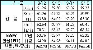 9월15일 59.23달러로 0.84달러 하락 … Brent유 하락에 WTI 상승 두바이(Dubai)유 가격이 다시 하락했다.한국석유공사에 따르면, 9월15일 거래된 중동산 두바이유 현물가격은 배럴당 59.23달러로 전날보다 0.84달러 하락했다. Brent유 현물가격은 배럴당 0.97달러 하락한 59.99달러를 형성했고, WTI(서부텍사스 중질유) 현물가격은 배럴당 0.07달러 상승한 63.30달러에 거래됐다. NYMEX(뉴욕상업거래소) WTI 선물유가는 배럴당 0.11달러 상승한 63.33달러, IPE(영국 국제석유거래소) Brent유는 배럴당 0.21달러 하락한 63.33달러에 거래가 종료됐다.