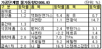 제조용이 원화환율 상승 및 수요 증가로 액화천연가스, 연광석 등 수입 광산품이 올라 전월대비 1.2%, 연료용은 액화천연가스, 유연탄 등 수입 연료광물이 올라 2.8% 상승했다. 중간재는 벙커C유가 2.4%, 자일렌(Xylene)이 7.0%, TPA(Terephthalic Acid)가 8.0%, 니켈이 16.9% 오르는 등 석유화학제품 및 금속1차제품을 중심으로 올라 1.3% 상승했다. 제조용이 공급과잉으로 수입 나프타(Naphtha)가 2.2% 내렸으나 니켈, 스텐레스 강판, 자일렌, TPA 등 대부분 품목이 오름세를 보여 1.5% 상승했다. 건설용은 원재료비 상승으로 전기용접강관, 동관, 나동선 등이 올라 0.5%, 연료ㆍ동력용은 수요 증가로 벙커C유, 부탄가스, 등유 등이 올라 0.8% 상승했다. 표, 그래프: | 가공단계별 물가동향(2006.8) | <화학저널 2006/09/18> |