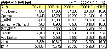 반면, LG필립스LCD라는 거대한 수요업체를 짊어지고 있는 LG화학은 시기적절한 라인 투자와 편광판용 부품 산업에 투자 등에 힘입어 2006년 상반기 18.6%의 시장 점유율로 2위 공급기업으로 부상했다. 세계 편광판의 생산능력은 2006년 상반기 9875만 평방미터를 기록했으며, 생산기업들의 활발한 투자로 2006년 하반기에는 약 1억1595만 평방미터의 규모까지 도달할 것으로 예상된다. 특히, 대형 TFT LCD 패널기업인 삼성전자와 LG필립스LCD로 편광판을 공급하고 있는 LG화학, 동우화인켐, 에이스디지텍 등의 활발한 생산능력 확대가 이루어질 것으로 예상된다. 한국 편광판 생산기업들의 활발한 라인 투자와 타이완 패널기업들의 편광판 생산 수직계열화 등으로 한국과 타이완 지역의 편광판 생산능력이 빠르게 증가하고 있는 것으로 나타났다. 2004년 상반기 당시 일본이 전 편광판 공급량의 57.3%를 차지하고 있었으나 2006년 상반기에는 43.5%로 점유율이 크게 감소했음을 알 수 있고, 반면에 LG화학은 2년 동안 시장점유율 8%가 상승했다. 2006년 상반기 편광판 시장은 TFT LCD 패널의 가격 하락으로 가격 조절 압력이 거세지고 있으며, 안정적인 생산을 위해 관련 부재 필름들의 개발 및 생산에 대한 요구가 커지고 있는 상황이다. 디스플레이뱅크 관계자는 “편광판은 국산화가 많이 진행되고 있지만 부재필름은 일본에 의존하고 있는 실정이기 때문에 진정한 의미의 국산화를 위해서는 부재필름의 개발에 힘써야 할 때”라고 강조했다. <김지은 기자>. 표, 그래프: | 편광판 생산능력 동향 | <화학저널 2006/09/18> |