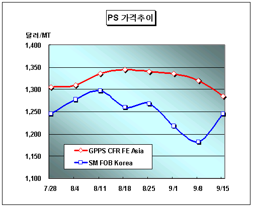 CFR FE Asia 톤당 1285달러 형성 … Total 프랑스 설비 폐쇄 계획 GPPS(General Purpose Polystyrene) 가격은 9월13일 CFR FE Asia 톤당 1280-1290달러로 35달러 하락했다.아시아 PS 시장은 업스트림인 벤젠(Benzene) 및 SM(Styrene Monomer) 가격강세에도 불구하고 중국수요 저하에 따른 약세를 면치 못했다. 벤젠 가격은 9월15일 FOB Korea 톤당 829-831달러로 10달러 상승했고 SM은 FOB Korea 톤당 1244-1246달러로 62달러 급등했다. PS 부문은 세계적인 수익 악화로 구조조정이 잇따르고 있는데 프랑스 Total Petrochemicals은 Gonfreville 소재 4만톤 생산라인을 2006년 말 폐쇄할 계획이며 Gonfreville 공장의 PS 생산능력은 현재 16만톤에 이르고 있는 것으로 알려졌다. 캐나다 Nova Chemicals과 영국 Ineos의 합작기업 Nova Innovene은 영국 Carrington 소재 PS 18만톤 플랜트를 10월 폐쇄하며 Dow Chemical은 2005년 12월 영국 Barry 소재 PS 7만톤 설비를 폐쇄한 데 이어 캐나다 PS 플랜트도 2006년 말 영구 가동중단할 방침이다. HIPS(High-Impact PS) 가격은 CFR FE Asia 톤당 1330-1340달러로 35달러 하락했다.