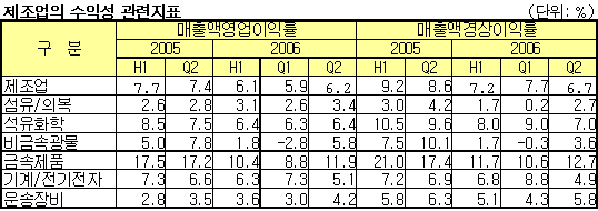 한은, 매출액영업이익률 6.4%로 0.1%p 상승 … 경상이익률은 하락 2/4분기 수익성이 하락한 산업이 대부분이었던 반면, 석유화학산업은 수출 호조로 하락폭이 크지 않았던 것으로 나타났다.한국은행이 발표한 <2006년 2/4분기 기업경영분석 결과>에 따르면, 환율 하락과 국제유가 상승의 여파로 2/4분기 국내기업들의 수익성이 최근 3년간 가장 악화된 것으로 나타났다. 2006년 2/4분기 조사대상 상장ㆍ등록법인의 매출액증가율(전년동기대비)은 7.0%로 1/4분기(6.9%)에 비해 소폭 상승했다. 비제조업의 매출액증가율(8.0%)이 제조업(6.3%)보다 높은 수준을 보였으나, 1/4분기에 비해 제조업(0.2%p)이 상승한 반면 비제조업(-0.2%p)은 소폭 하락했다.