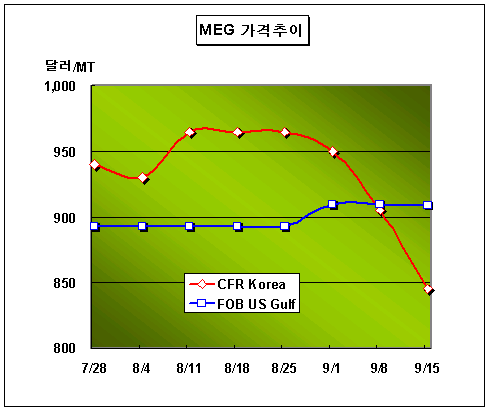 CFR Korea 톤당 845달러 형성 … Nan Ya의 No.2 가동중단이 변수 MEG(Monoethylene Glycol) 가격은 9월15일 CFR Korea 톤당 843-847달러로 60달러 급락했다.아시아 MEG 시장은 에틸렌(Ethylene) 가격하락과 중국 폴리에스터(Polyester) 부문의 가동률 감축에 따라 순식간에 850달러대가 무너졌다. 에틸렌 가격은 9월15일 FOB Korea 톤당 1370-1380달러로 60달러 급락했으며 중국 폴리에스터 섬유 생산기업들의 가동률은 65% 수준으로 파악되고 있다. 다만, 타이완 Nan Ya Plastics의 Mailiao 소재 No.2 MEG 30만톤 설비가 에틸렌 공급부족에 따라 10월 3째주 가동을 중단하고 No.1 및 No.3 총 60만톤 생산라인도 80% 가동률에 그쳐 변수가 될 전망이다. 아시아 10월 계약가격(CP)은 MEGlobal과 Sabic이 CFR Asia 톤당 990달러를 고시해 보합세를 유지했고 Shell은 톤당 1020달러로 30달러 인상을 단행했다.