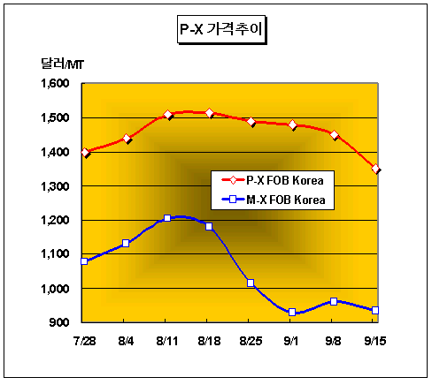 FOB Korea 톤당 1352달러 형성 … 10월 CP 1450달러 고공행진 P-X(Para-Xylene) 가격은 9월15일 FOB Korea 톤당 1351-1353달러로 98달러 폭락했다.아시아 P-X 시장은 업스트림인 M-X(Mixed-Xylene) 하락세와 중국수요 저하 및 신규설비 가동 임박에 따른 기대감으로 폭락장을 경험했다. M-X 가격은 FOB Korea 톤당 935달러로 25달러 하락했으며 P-X와의 스프레드는 전주 톤당 490달러에서 톤당 417달러로 좁혀졌다. 중국 Qingdao Lidong의 Qingdao 소재 신규 Aromatics 설비는 조만간 가동에 돌입할 예정으로 생산능력은 벤젠(Benzene) 20만-25만톤, 톨루엔(Toluene) 10만-15만톤, P-X 63만톤에 이르는 것으로 알려졌다. 아시아 10월 계약가격(CP)은 고공행진을 이어갔는데 Japan Energy와 ExxonMobil은 전월대비 70달러 인상한 CFR Asia 톤당 1470달러, Idemitsu는 30달러 인상한 톤당 1430달러로 고시했다.