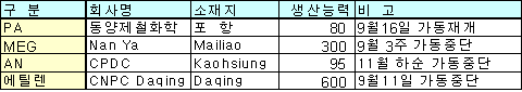 CNPC Daqing은 화재로 가동중단 … CNPC Lanzhou는 가동준비 동양제철화학의 PA(Phthalic Anhydride) 설비가 9월18일 정상가동 중인 것으로 나타났다.동양의 포항 소재 PA 8만톤 설비는 경미한 트러블로 9월9일 유지보수에 들어가 9월16일 재가동에 들어간 것으로 알려졌다. 중국 CNPC Daqing Petrochemical은 9월11일 발생한 화재로 가동이 전면 중단됐으며 생산능력은 에틸렌(Ethylene) 60만톤, 프로필렌(Propylene) 32만톤, LDPE(Low-Density PE) 38만톤으로 파악되고 있다. CNPC Lanzhou Petrochemical의 신규 컴플렉스는 10월초 가동에 들어가는데 에틸렌 45만톤 크래커를 비롯해 부타디엔(Butadiene) 9만톤, PP(Polypropylene) 30만톤, LDPE 20만톤, HD/LLDPE 병산 30만톤 플랜트를 포함하고 있으며 에틸렌 생산능력은 총 69만톤으로 확대됐다.