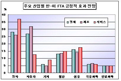 전경련, 6%만 긍정적 효과 응답 … 정밀화학 5%에 전자 28% 긍정적 석유화학기업들은 한국-미국 FTA가 체결되더라도 긍정적인 효과가 별로 없다고 예상하고 있다는 조사 결과가 발표됐다.전국경제인연합회가 발표한 <한국-미국 FTA 기업의견조사 결과>에 따르면, 국내기업들은 한국-미국 FTA가 체결되면 투자유치가 늘어나고, 수출이 신장할 것으로 기대하고 있는 것으로 분석됐다. 전체 응답기업 가운데 제조업의 66.7%, 서비스업의 66.0%가 한-미 FTA가 투자유치 확대와 수출증대에 긍정적으로 작용할 것으로 답변했다. 경제시스템 선진화, 국민후생 증대, 현지투자조건 개선 등에 대해서도 긍정적인 영향을 기대했다. 반면, 소비재수입은 38.3%만이 늘어날 것으로 답변함으로써 소비재 수입 증가효과는 제한적일 것으로 국내기업들은 내다보고 있었다.