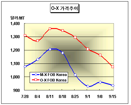 PA와 DOP는 50-55달러 급락 … M-X와의 스프레드 138달러 O-X(Ortho-Xylene) 가격은 9월15일 FOB Korea 톤당 1070-1075달러로 90달러 폭락했다.아시아 O-X 시장은 원료인 M-X(Mixed-Xylene)와 다운스트림인 PA(Phthalic Anhydride) 및 DOP(Dioctyl Phthalate) 약세 및 중국수요 감소에 따라 1100달러대가 무너졌다. M-X는 FOB Korea 톤당 934-936달러로 25달러 하락했고 PA는 CFR FE Asia 톤당 1345달러로 55달러, DOP는 CFR FE Asia 톤당 1630달러로 50달러 급락했다. 중국 내수가격은 ex-Works 톤당 1만1800위안으로 900위안 폭락했으며 10월1일부터 시작되는 국경절 연휴에 따라 다운스트림 부문의 감축운영이 이루어지고 있는 상황으로 알려졌다. CFR China/SE Asia 가격은 톤당 1090-1100달러를, CFR India는 톤당 1125-1135달러를 형성했다.