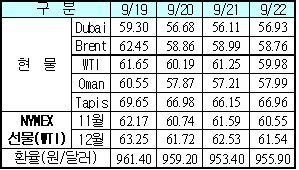 9월22일 56.93달러로 0.82달러 상승 … Brent유와 WTI 하락 두바이(Dubai)유 가격이 다시 상승했다.한국석유공사에 따르면, 9월22일 거래된 중동산 두바이유 현물가격은 배럴당 56.93달러로 전날보다 0.82달러 상승했다. Brent유 현물가격은 배럴당 0.23달러 하락한 58.76달러를 형성했고, WTI(서부텍사스 중질유) 현물가격은 배럴당 1.27달러 하락한 59.98달러에 거래됐다. NYMEX(뉴욕상업거래소) WTI 선물유가는 배럴당 1.04달러 하락한 60.55달러, IPE(영국 국제석유거래소) Brent유는 배럴당 0.93달러 하락한 60.41달러에 거래가 종료됐다.