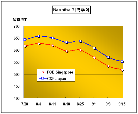 표, 그래프: | Naphtha 가격추이 | <화학저널 2006/09/23> |