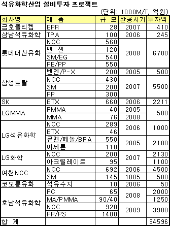 LG상사와 SK는 카자흐스탄 8광구 탐사권을 공동 획득해 운영하고 있으며, GS칼텍스는 카자흐스탄 정부와 석유화학산업 전반에 대한 공동 프로젝트를 2006년 7월 수행했다. 이에 따라 카자흐스탄이 보유하고 있는 천연자원과 한국의 원유ㆍ가스 가공산업에서 뛰어난 공정ㆍ생산기술과 경험 노하우 등의 상호 접목을 통해 양국 석유화학산업의 동반성장이 가능할 전망이다. 산자부 관계자는 “카자흐스탄은 한국의 석유화학산업이 많은 경험과 우수한 기술을 보유하고 있는 점을 고려해 한국측에게 석유화학공장 건설 및 기술자문, 인력 교육ㆍ양성, 운전 및 유지보수 등의 지원을 요청했다”며 “국내기업의 카자흐스탄 진출 활성화로 중국 중심의 수출 지역편중 현상 완화와 유럽시장 진출확대에 따른 수출지역 다변화에도 큰 기여를 할 수 있을 것”이라고 기대했다. GS칼텍스는 양국 업계간 협력 구체화를 위해 11월 카자흐스탄 에너지광물자원부 장관 방한시 국영석유공사(KMG)와 석유화학 공장 운영 및 지원협력에 관한 MOU를 체결할 예정이다. 한편, 국내 석유화학기업들은 2005-09년 3조4596억원을 투입해 BTX, PMMA(Polymethyl Methacrylate)를 비롯한 특화제품의 신증설 투자를 가속화하고 있다. <김지은 기자> 표, 그래프: | 석유화학산업 설비투자 프로젝트 | <화학저널 2006/09/25> |