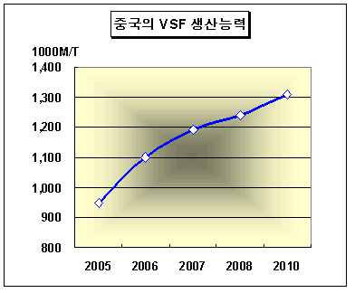 중소기업 통폐합과 생산능력 합리화에 의한 구조조정도 이어지고 있는데 2003-05년 13만4600톤의 생산능력이 감소했고 2010년 이전까지 15만-20만톤의 생산능력 상실이 예상되고 있다. 표, 그래프: | 중국 VSF 생산능력 | <화학저널 2006/09/27> |