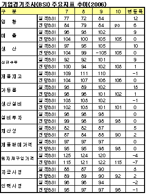 한은, 업황BSI 83으로 14p 상승 … 제조업 84로 12p 올라 화학산업을 비롯한 대부분의 제조업의 9월 기업경기가 개선된 것으로 나타났다.한국은행이 발표한 <2006년 9월 기업경기조사 결과>에 따르면, 제조업의 9월 업황BSI가 84, 10월 업황 전망BSI가 90으로 각각 12p, 6p 상승했다. 9월 업황BSI는 대기업이 90으로 13p, 중소기업이 80으로 11p, 수출기업이 89로 5p, 내수기업이 81로 15p 상승했다. 영상ㆍ음향ㆍ통신장비는 91로 16p, 자동차가 76으로 14p, 화합화학이 83으로 14p 상승하는 등 대부분의 산업에서 상승한 것으로 나타났다.