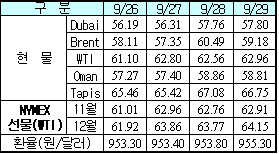 9월29일 57.80달러로 0.04달러 상승 … Brent유 하락에 WTI 올라 두바이(Dubai)유 가격이 상승했다.한국석유공사에 따르면, 9월29일 거래된 중동산 두바이유 현물가격은 배럴당 57.80달러로 전날보다 0.04달러 상승했다. Brent유 현물가격은 배럴당 1.31달러 하락한 59.18달러를 형성했고, WTI(서부텍사스 중질유) 현물가격은 배럴당 0.40달러 상승한 62.96달러에 거래됐다. NYMEX(뉴욕상업거래소) WTI 선물유가는 배럴당 0.15달러 상승한 62.91달러, IPE(영국 국제석유거래소) Brent유는 배럴당 0.06달러 하락한 62.48달러에 거래가 종료됐다.