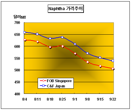 표, 그래프: | Naphtha 가격추이 | <화학저널 2006/09/30> |
