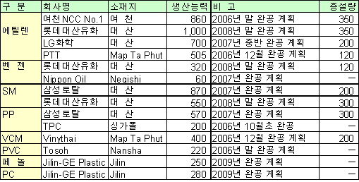 여천ㆍ호남ㆍ삼성 투자 잇따라 … LG석유화학 OCU는 10월 가동 아시아 화학기업들의 신증설 열기가 고조되고 있다.국내에서는 여천NCC, LG화학, 삼성토탈, 롯데대산유화 등이 2009년까지 에틸렌(Ethylene) 등 기초유분과 다운스트림 부문 신증설에 총 3조4596억원 가량을 투자할 계획이다. 여천 NCC의 No.1 크래커는 10월11일부터 11월29일까지 50일간의 정기보수에 돌입할 계획으로 정기보수 기간 Debottlenecking을 실시해 에틸렌(Ethylene) 생산능력을 51만톤에서 86만톤으로, 프로필렌(Propylene) 생산능력을 25만톤에서 45만톤으로, 부타디엔(Butadiene) 생산능력을 17만톤에서 22만톤으로 증설할 계획이다. 롯대대산유화는 2008년까지 에틸렌 생산능력을 65만톤에서 100만톤으로, 프로필렌 생산능력을 32만5000톤에서 50만톤으로 증설할 방침으로 호남석유화학 합산 에틸렌 172만톤 시대를 열 것으로 보인다.