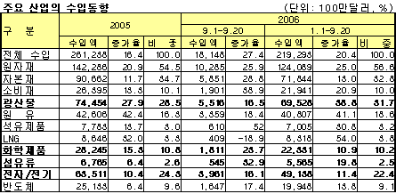 산자부, 9월 1-20일 23.7% 증가해 18억1100만달러 … 사상최고 화학제품의 9월 1-20일 수입이 23.7% 증가한 18억1100만달러를 기록한 것으로 나타났다.산업자원부가 발표한 <2006년 9월 및 3/4분기 수출입동향>에 따르면, 9월 수입은 22.8% 증가한 279억달러로 사상 최고치를 기록했다. 일평균 수입도 11억9000만달러로 역시 사상 최고치를 기록한 것으로 나타났다. 수입은 국제유가 상승, 석유제품 수출 확대 등에 따라 원유 수입이 증가해 전체 수입증가를 견인한 것으로 나타났다.