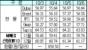 10월6일 56.64달러로 0.33달러 하락 … Brent유ㆍWTI도 내려 두바이(Dubai)유 가격이 하락했다.한국석유공사에 따르면, 10월6일 거래된 중동산 두바이유 현물가격은 배럴당 56.64달러로 전날보다 0.33달러 하락했다. Brent유 현물가격은 배럴당 0.79달러 하락한 56.58달러를 형성했고, WTI(서부텍사스 중질유) 현물가격은 배럴당 0.30달러 하락한 59.68달러에 거래됐다. NYMEX(뉴욕상업거래소) WTI 선물유가는 배럴당 0.27달러 하락한 59.76달러, IPE(영국 국제석유거래소) Brent유는 배럴당 0.17달러 하락한 59.83달러에 거래가 종료됐다.