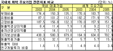 대부분의 국내 주요기업의 매출액증가율이 세계 주요기업보다 낮은 가운데 화학산업은 2005년 37.8%로 세계의 15.6%의 2배 이상에 달했는데 이는 호남석유화학이 종속기업을 신규 편입했기 때문으로 분석된다. 또 최근 3년간 경영성과 변화추세를 보면 부채비율이 지속적으로 낮아지고 금융비용 부담이 경감되는 등 국내 대표기업과 세계 주요기업간 경영성과의 동조화 현상도 나타난 것으로 분석됐다.