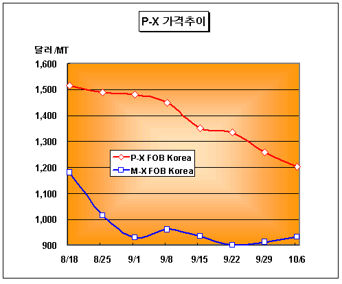 스프레드 269달러로 축소 … KP ChemㆍNippon Oil 정기보수 변수 P-X(Para-Xylene) 가격은 10월6일 FOB Korea 톤당 1201-1202달러로 58달러 급락했다.아시아 P-X 시장은 업스트림인 M-X(Mixed-Xylene) 상승에도 불구하고 수요 저하 및 계약가격(CP) 폭락에 따라 톤당 1200달러대가 위협받고 있다. M-X 가격은 FOB Korea 톤당 933달러로 20달러 상승했으며 P-X와의 스프레드는 전주 톤당 347달러에서 톤당 269달러로 좁혀졌다. ExxonMobil과 Nippon Oil의 아시아 10월 계약가격은 CFR Asia 톤당 1260달러로 전월대비 140달러 폭락했다. 다만, Nippon Oil의 Mizushima 소재 P-X 21만5000톤 플랜트가 10월 2째주 60일간의 정기보수에 들어가고 KP케미칼의 울산 소재 No.1 P-X 20만톤 및 No.2 50만톤 설비가 10월22일-10월29일 정기보수를 예정하고 있어 변수가 될 전망이다.
