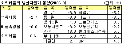 공산품은 2006년 8월과 동일하고, 2005년 9월에 비해 3.6% 상승했는데 석유제품, 비금속광물제품이 내림세를 보인 반면, 전기기계 및 장치제품, 화학제품 등이 올랐다. 석유제품은 국제유가 하락의 영향으로 경유가 전월대비 3.9%, 휘발유가 5.4%, 등유가 3.9%, 나프타가 8.5% 내려 전체적으로는 2.7% 하락했다. 비금속광물제품은 건설경기 부진으로 보통시멘트가 3.2%, 가공판석이 1.3%, 보통판유리가 2.4% 하락하는 등 내림세를 지속해 전체적으로 0.6% 하락했다. 화학제품은 유가하락으로 에틸렌(Ethylene)이 2.78%, SM(Styrene Monomer)이 4.5% 내린 반면, 원료코스트 상승, 공급 감소 등으로 P-X(Para-Xylene)가 13.0%, 폴리에스터(Polyester) 섬유가 5.5%, 부타디엔(Butadiene)이 5.9%, PVC(Polyvinyl Chloride)가 8.0% 올라 전체적으로는 0.6% 상승했다. <김지은 기자> 표, 그래프: | 화학제품의 생산자물가 동향(2006.9) | <화학저널 2006/10/10> |