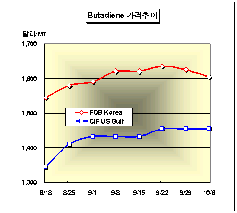 | 국제유가 및 나프타 약세 지속으로 … SK 부타디엔 2만톤 증설부타디엔(Butadiene) 가격은 10월6일 FOB Korea 톤당 1600-1610달러로 20달러 하락했다. 아시아 부타디엔 시장은 국제유가 및 나프타(Naphtha) 약세와 SK의 부타디엔 2만톤 증설 완료에 따라 하락세를 면치 못했다. 국제유가는 10월6일 WTI(서부텍사스중질유) 선물가격이 배럴당 59.76달러로 전일대비 0.27달러, 두바이유 현물가격은 배럴당 56.64달러로 0.33달러 하락했다. 나프타 가격은 C&F Japan 톤당 535달러로 7달러 하락했고 SK의 울산 소재 No.2 부타디엔 설비는 크래커 정기보수 기간 중 Debottlenecking을 통해 생산능력이 9만톤에서 11만톤으로 확장됐다. CFR China/SE Asia 가격은 톤당 1620-1630달러를 형성했다.