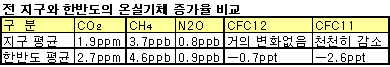 전 지구의 1994-2004년 이산화탄소의 증가량이 연평균 1.9ppm이었던 반면, 한반도 부근에서의 이산화탄소는 1999-2005년 연평균 2.7ppm으로 42% 높게 나타났으며, 메탄가스는 전 지구가 3.7ppb, 한반도는 4.6ppb로 나타나 24% 높은 것으로 분석됐다. N2O는 지구가 0.8ppb, 한반도가 0.9ppb로 소폭 높았으며, 한반도의 CFC12는 0.7ppt, CFC11은 2.6ppt 감소한 것으로 나타났다. 여름철에는 식물활동이 활성화됨에 따라 감소하고 겨울철에는 식물활동의 감소, 난방, 산업 활동 등으로 인해 증가하는 계절 변동을 보였다. 1999년에서 2005년 온실기체 복사강제력은 전 지구적으로는 7% 증가했고, 한반도 부근에서는 10% 증가한 것으로 분석됐다. 또 최근 7년 동안 한반도 부근의 온실기체에 의해 복사강제력이 0.252Wm-2 증가했는데 이 중 94%인 0.237Wm-2는 이산화탄소에 의해 발생된 것으로 나타났다. 기상연구소는 중국과 한반도 부근의 산업화와 도시화를 반영한 것으로 분석하고 있다. 표, 그래프: | 전 지구와 한반도의 온실기체 증가율 비교 | <화학저널 2006/10/13> |