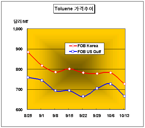 중국 수요기업 관망세 참여 저조 … Qingdao Lidong 가동 임박 톨루엔(Toluene) 가격은 10월13일 FOB Korea 톤당 727-728달러로 55달러 급락했다.아시아 톨루엔 시장은 국제유가 상승에도 불구하고 휘발유 Blending 수요 저하 및 중국 수요기업들의 관망세로 급락세를 면치 못했다. 국제유가는 10월13일 WTI(서부텍사스중질유) 선물가격이 배럴당 58.57달러로 전일대비 0.71달러, 두바이유 현물가격은 배럴당 56.28달러로 0.91달러 상승했다. 중국 수요기업들은 추가 하락 기대에 따라 시장참여를 자제했으며 11월 중순 신규가동에 돌입하는 중국 Qingdao Lidong의 Aromatics 생산능력은 벤젠(Benzene) 26만톤, 톨루엔 14만톤, P-X(Para-Xylene) 70만톤에 이르는 것으로 알려졌다. CFR China 가격은 톤당 734-736달러, CFR SE Asia는 톤당 750-765달러를 형성했으며 중국 내수가격은 ex-Tank 톤당 7750-7800위안에 마감됐다.
