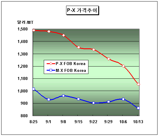 FOB Korea 톤당 1055달러 형성 … 삼성 등 PTA 감산 줄줄이 이어져 P-X(Para-Xylene) 가격은 10월13일 FOB Korea 톤당 1054-1056달러로 147달러 폭락했다.아시아 P-X 시장은 업스트림인 M-X(Mixed-Xylene) 급락세와 다운스트림 부문의 감산에 따라 톤당 1100달러대가 무너졌다. M-X 가격은 10월13일 FOB Korea 톤당 858-862달러로 73달러 급락했으며 P-X와의 스프레드는 전주 톤당 269달러에서 톤당 195달러로 좁혀졌다. 9월26일 가동을 중단한 삼성석유화학의 서산 소재 PTA(Purified Terephthalic Acid) 70만톤 플랜트는 10월13일 재가동 여부 결정을 유보했으며 10월17-18일 재가동 여부에 대한 재결정에 들어갈 것으로 알려졌다. 9월22일 중단된 삼남석유화학의 여수 소재 PTA 55만톤 플랜트 역시 재가동 시점을 면밀히 검토하고 있으며 시황을 예의주시하고 있는 상황이다.