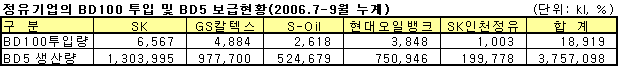 BD5는 5% 이하의 바이오디젤이 기존경유와 혼합된 경유 생산능력 9만5000㎘를 고려해 보급물량 9만㎘가 결정됐으며, 수송용 경유에 혼합할 경우 0.5%가 된다. BD20은 정비시설과 주유시설을 갖춘 사업장의 차량 등에 한정해 제한적으로 보급하고 있다. BD20은 바이오디젤 20%와 기존경유 80%가 혼합된 석유대체연료로 2006년 7-9월 바이오디젤기업이 생산해 정유기업에 공급한 바이오디젤 원액은 2005년 보급량인 1만5000㎘를 상회하는 것으로 나타났다. 정유기업 구입량은 2005년 3개월 평균물량 3만8000㎘보다 450% 증가함으로써 바이오디젤 보급이 크게 촉진되고 있다. 정유기업은 BD100 18만9000㎘를 투입해 혼합경유 BD5 375만7000㎘를 보급하며, 혼합비율은 0.5%로 일정하게 유지하고 있다. 산자부는 “BD20은 정비시설과 주유시설을 갖춘 지정사업장에 4.8㎘ 보급됐으며 향후 보급이 더욱 확대될 것으로 전망”된다며 “정부에서는 협의회 제안을 바탕으로 연차별 보급물량 및 혼합비율, 지원 방안 등 BD 보급 중장기 종합대책을 2006년 수립할 계획”이라고 강조했다. 표, 그래프: | 정유기업의 BD100 투입 및 BD5 보급현황(2006.7-9월 누계) | <화학저널 2006/10/18> |