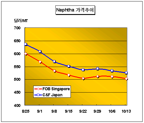 한편, 나프타 가격은 10월13일 C&F Japan이 톤당 527달러로 8달러, FOB Singapore가 톤당 503달러로 9달러 하락했다.