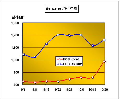 FOB Korea 톤당 990달러 형성 … Citgo에 BASF-Total도 가동중단 벤젠(Benzene) 가격은 10월20일 FOB Korea 톤당 989-991달러로 130달러 폭등했다.아시아 벤젠 시장은 미국의 생산설비 트러블 발생에 따른 아시아산 수출 호조에 힘입어 단숨에 900달러대를 뛰어넘었다. 미국 Citgo의 루이지애나 Lake Charles 소재 정유공장 Reformer는 10월 3째주 정전으로 가동이 중단됐으며 Westlake Chemical의 벤젠 플랜트도 트러블을 일으킨 것으로 알려졌다. BASF-Total Petrochemical의 텍사스 Port Arthur 소재 설비도 벤젠 추출상의 문제를 일으킨 것으로 파악되고 있다. 이에 따라 아시아산 벤젠 거래가 활성화됐으며 아시아-미국 운송코스트는 톤당 75달러에 이른 것으로 나타났다. FOB SE Asia 가격은 톤당 992-993달러, CFR Taiwan 가격은 톤당 1025-1026달러에 마감됐다.