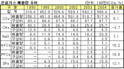 산자부, 2004년 5억9060만tCO2로 1.4% 증가 … 감소추세 한국의 온실가스 배출 증가세가 둔화되고 있는 것으로 나타났다.산업자원부에 따르면, 2004년 온실가스 배출량은 5억9060만tCO2로 전년대비 1.4% 증가하는데 그쳤다. 1990년 이후 연평균 4.7%의 증가세를 기록했으나 매년 감소추세를 이어가고 있다.
