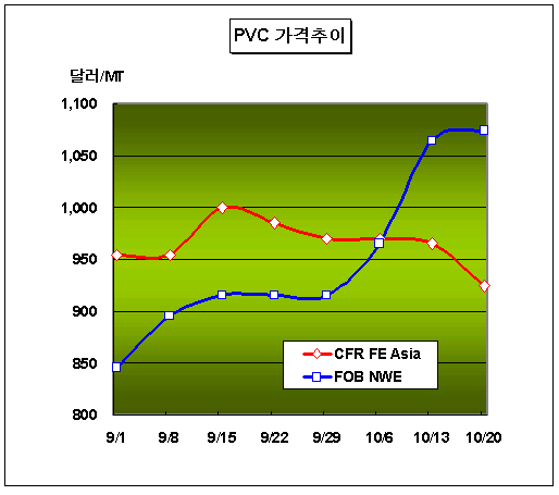 유럽시장 전주 100달러 폭등 … Arkema의 VCM 불가항력에 따라 PVC(Polyvinyl Chloride) 가격은 10월18일 CFR FE Asia 톤당 920-930달러로 40달러 급락했다.아시아 PVC 시장은 에틸렌(Ethylene) 약세와 중국시장 수요 부진에 따라 톤당 950달러대가 무너져 유럽시장과 대조를 보였다. 에틸렌은 10월20일 FOB Korea 톤당 1105달러로 40달러 급락했고 중국 내수가격은 에틸렌 베이스 PVC가 톤당 7600-7800위안으로 100위안 폭락했으며 카바이드(Carbide) 베이스가 톤당 6900-7000위안을 형성했다. 유럽의 PVC 가격은 10월11일 FOB NWE 톤당 1065달러로 100달러 폭등한 후 10월18일 10달러 상승한 1075달러를 형성했다. 프랑스 Arkema의 Lavera 소재 VCM(Vinyl Chloride Monomer) 45만톤 설비가 9월말 불가항력을 선언했기 때문으로 Arkema의 Balan 소재 PVC 32만톤 및 St Fons 소재 PVC 25만톤 플랜트 뿐만 아니라 수요처인 포르투갈 Cires의 Estarreja 소재 PVC 20만톤 설비도 감축 운영중인 것으로 파악되고 있다.