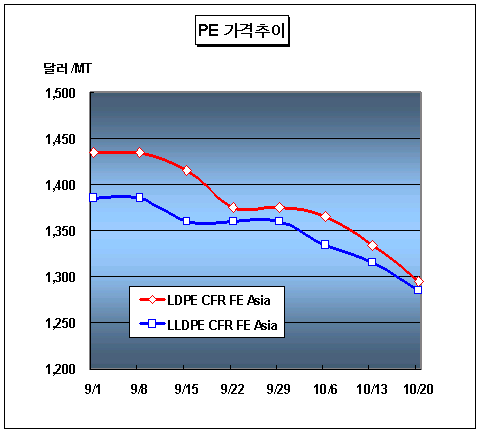 표, 그래프: | PE 가격추이 | <화학저널 2006/10/23> | ||||||||||||||||